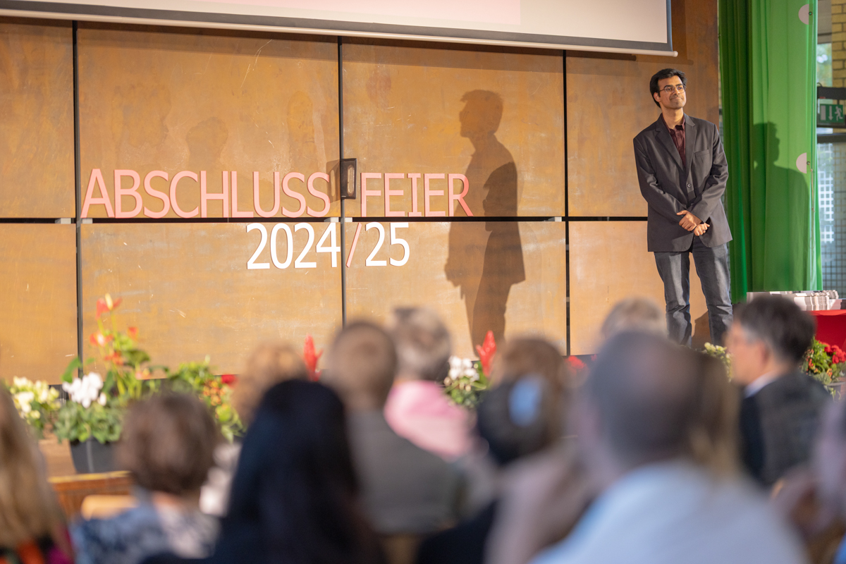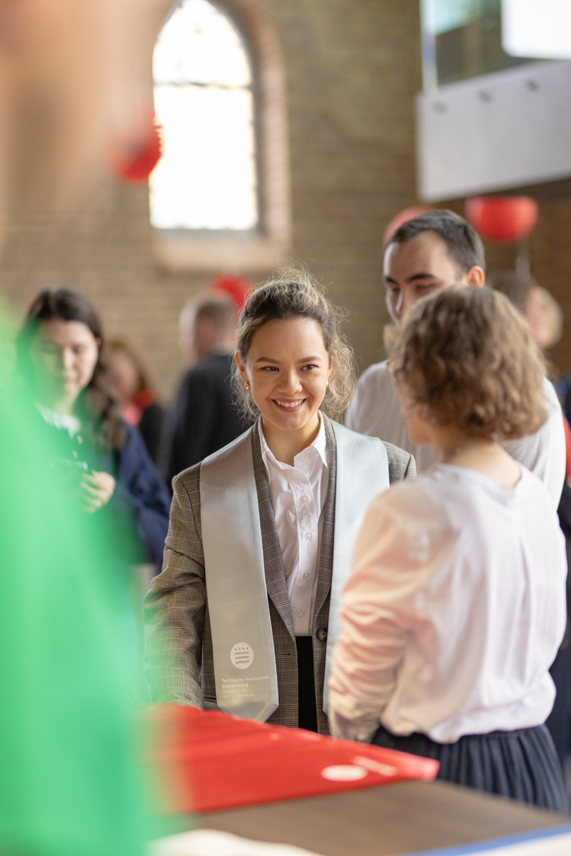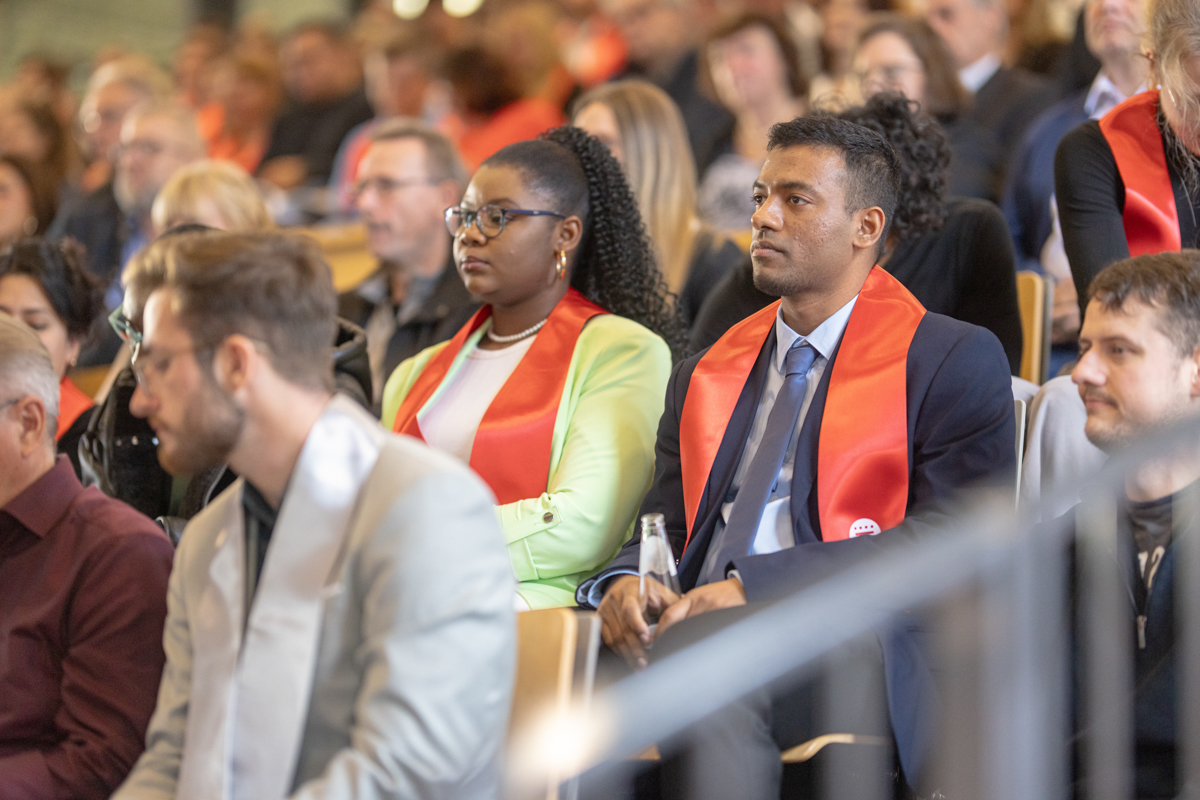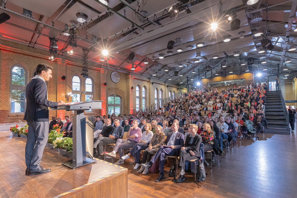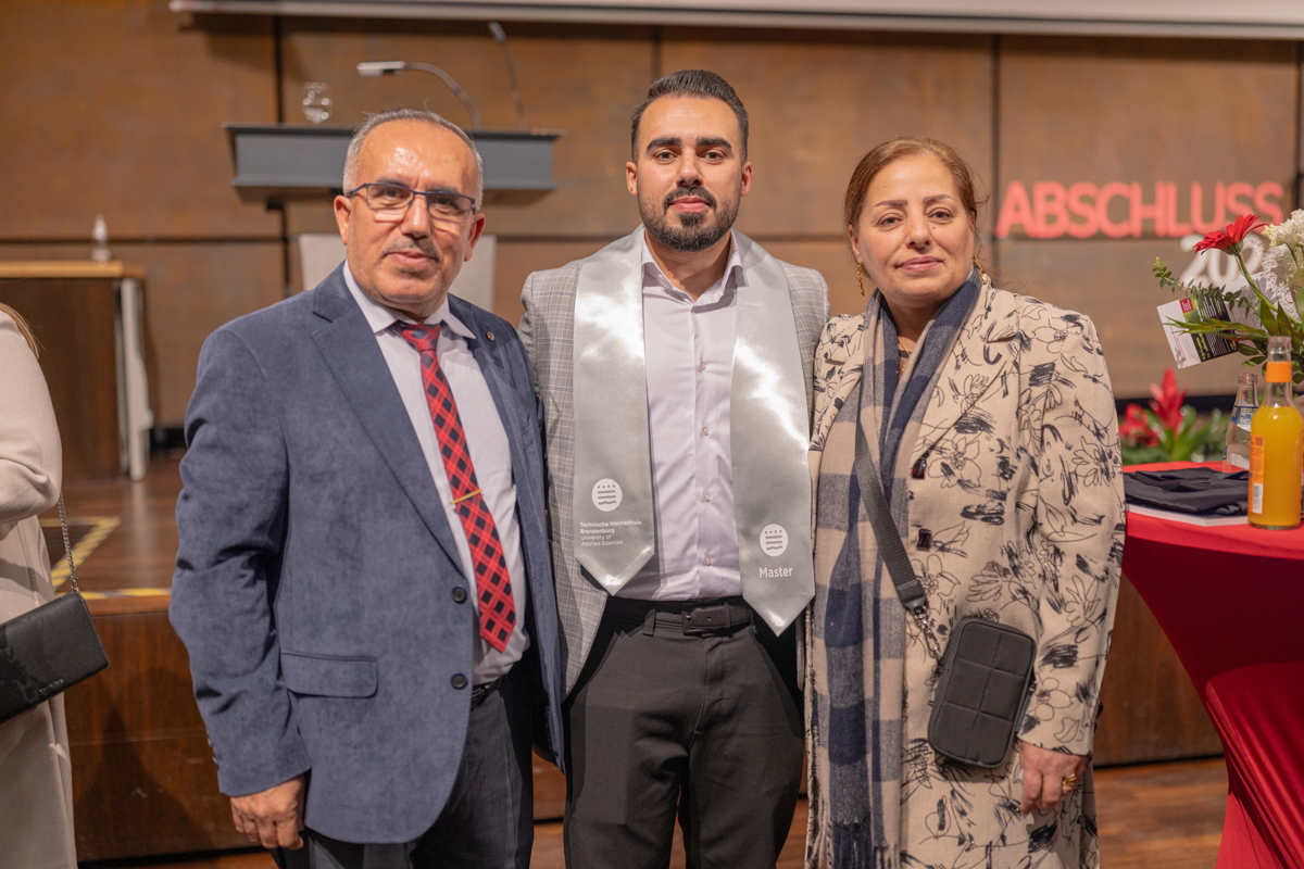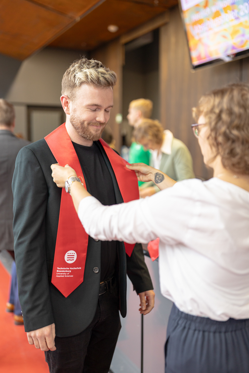 Mit Fayiq Abubakr stand ein weiterer internationaler Student auf der Bühne des Audimax. Er kam vor zehn Jahren als Flüchtling nach Deutschland und machte in der Folge an der THB sowohl einen Bachelor- als auch einen Masterabschluss. In einer kurzen Rede erzählte er von seiner persönlichen Geschichte, die von Herausforderungen geprägt war, in der er aber auch immer wieder gesellschaftlichen Zusammenhalt erlebt hat. Hierüber drückte er seine Dankbarkeit aus und wollte gleichzeitig andere auf ihrem weiteren Weg ermutigen.