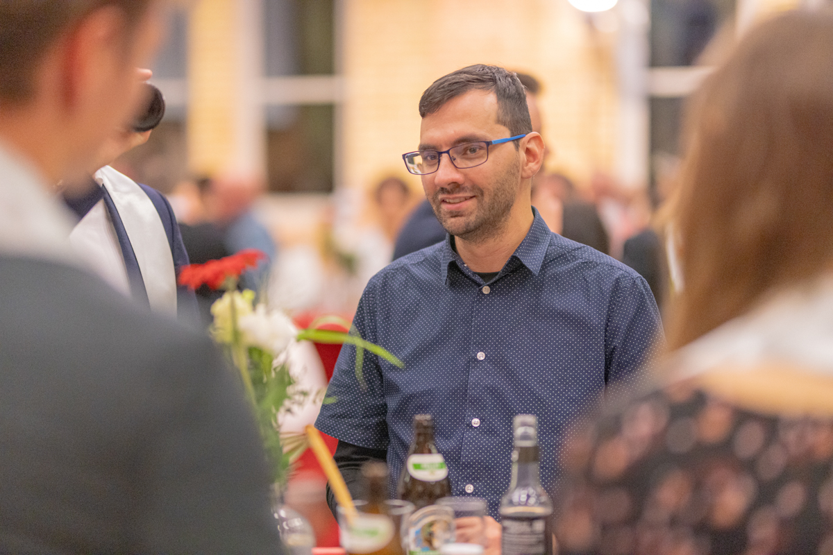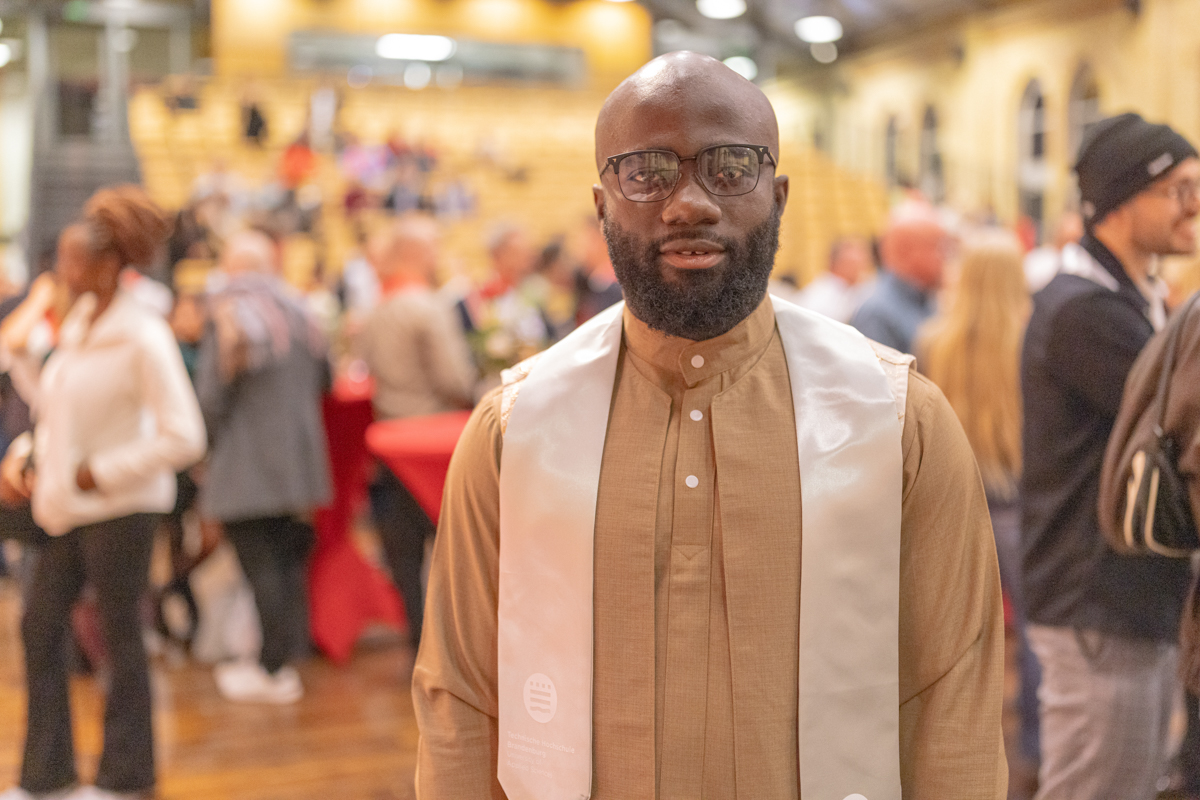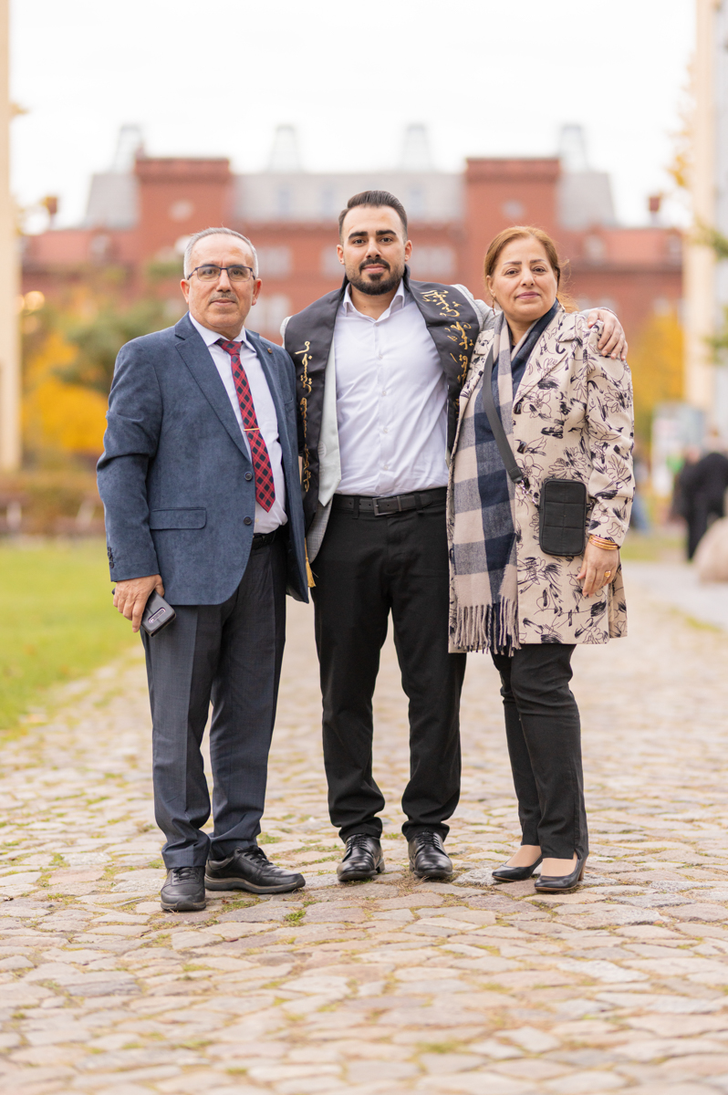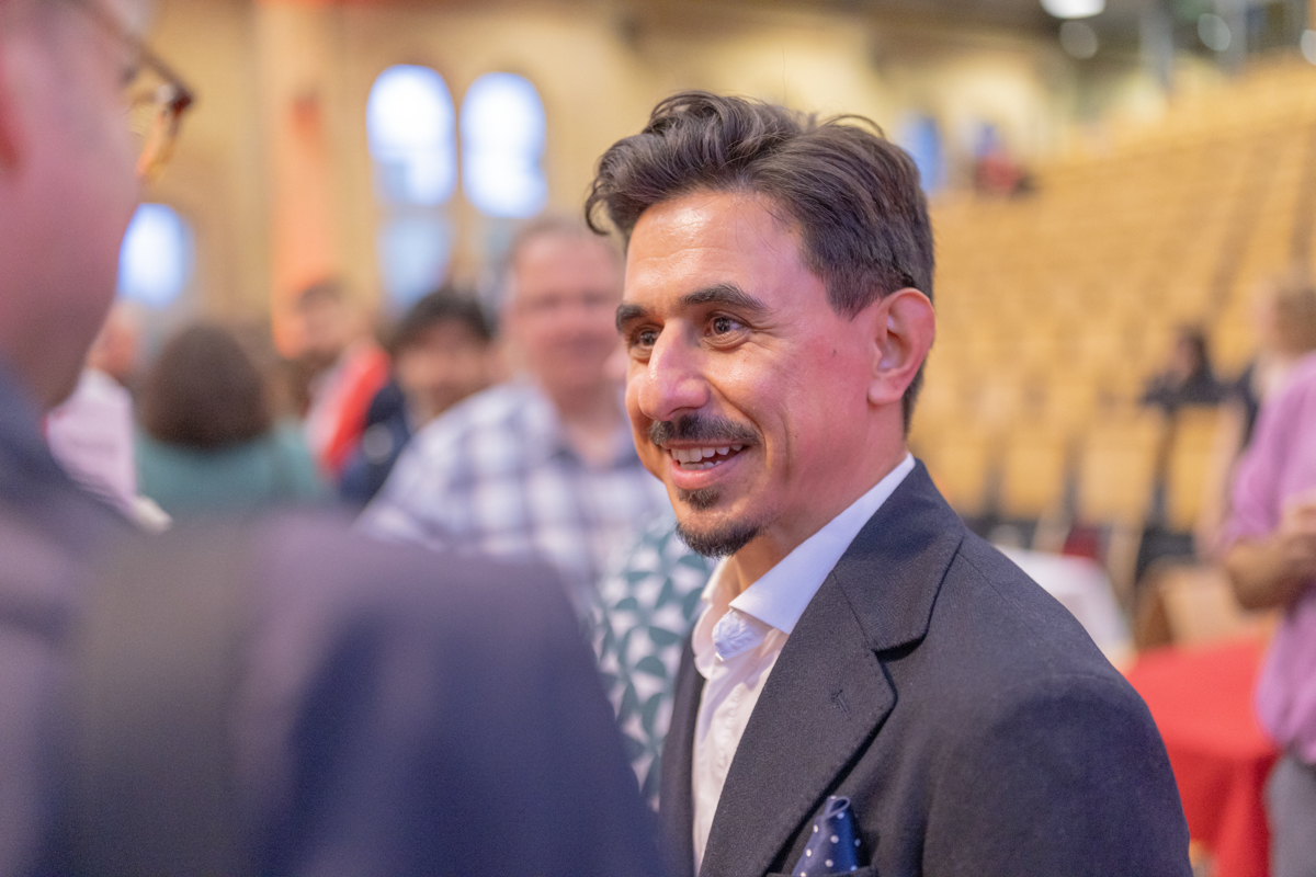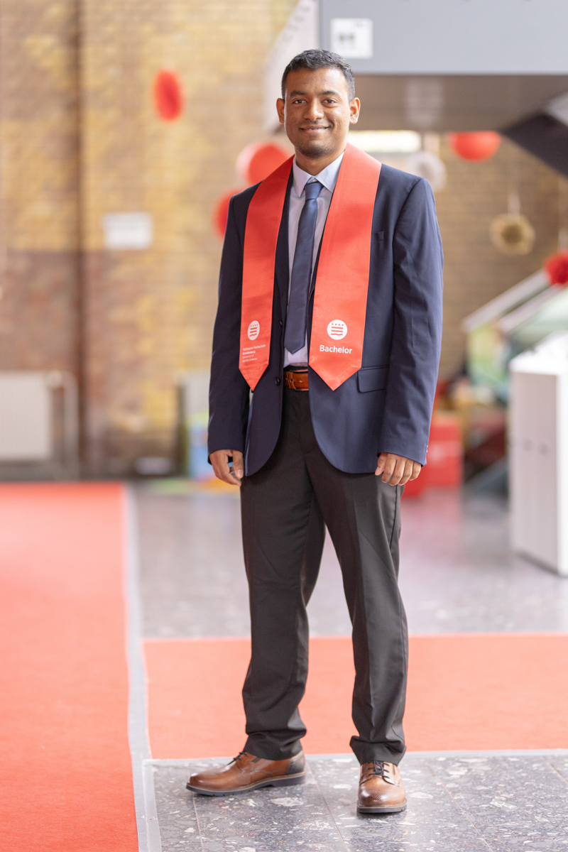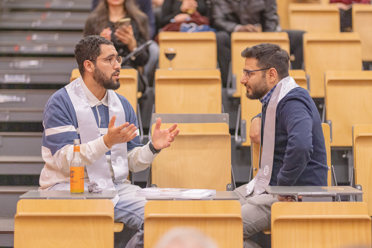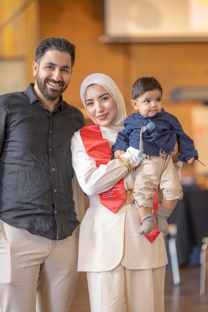 Mit Fayiq Abubakr stand ein weiterer internationaler Student auf der Bühne des Audimax. Er kam vor zehn Jahren als Flüchtling nach Deutschland und machte in der Folge an der THB sowohl einen Bachelor- als auch einen Masterabschluss. In einer kurzen Rede erzählte er von seiner persönlichen Geschichte, die von Herausforderungen geprägt war, in der er aber auch immer wieder gesellschaftlichen Zusammenhalt erlebt hat. Hierüber drückte er seine Dankbarkeit aus und wollte gleichzeitig andere auf ihrem weiteren Weg ermutigen.