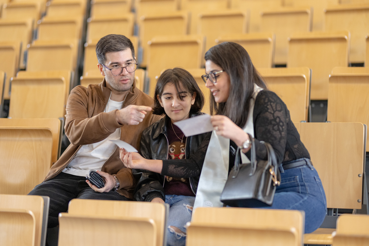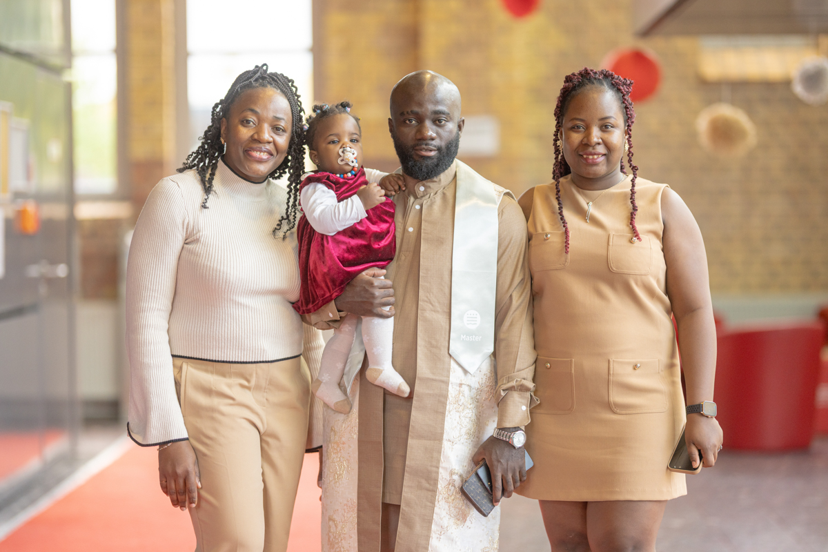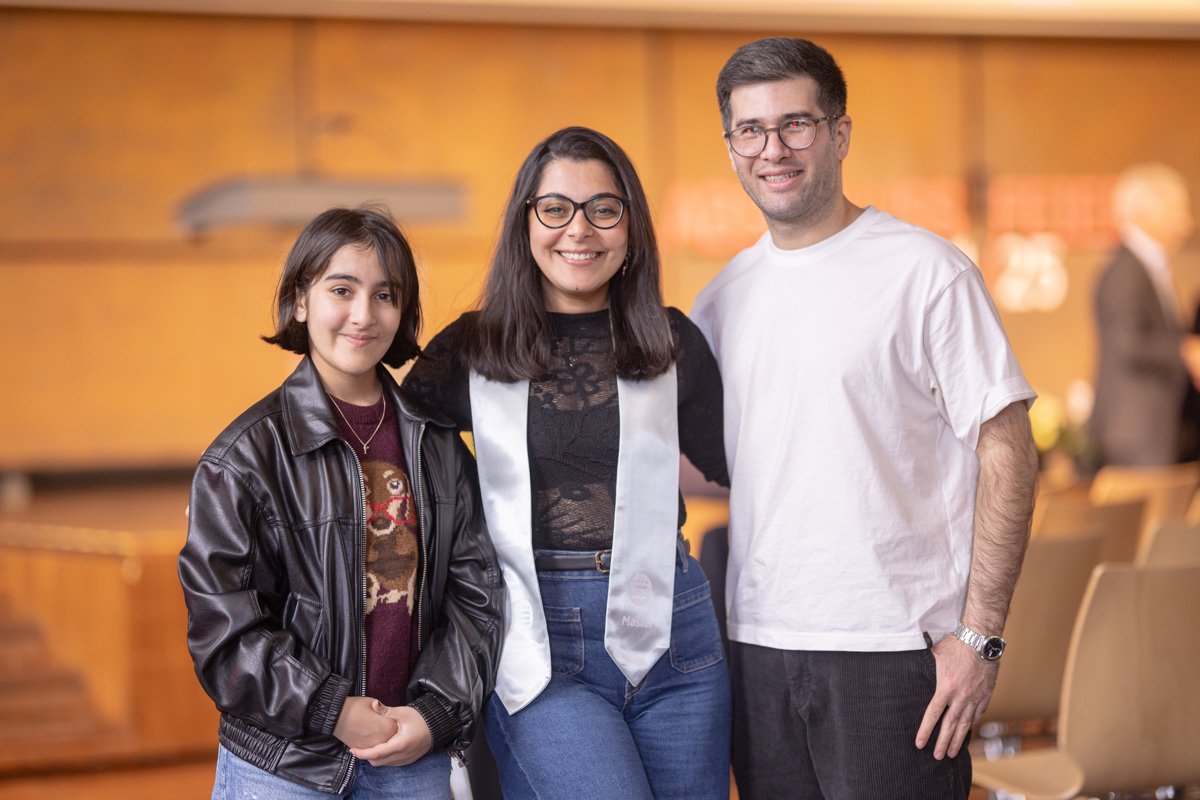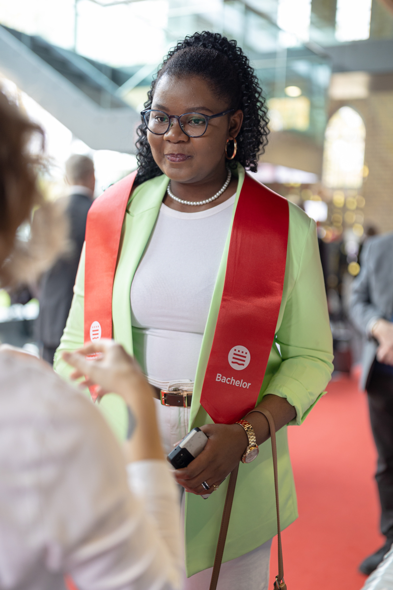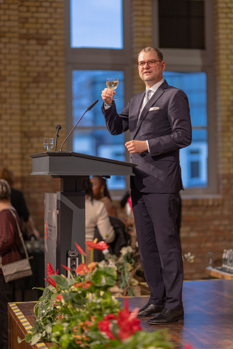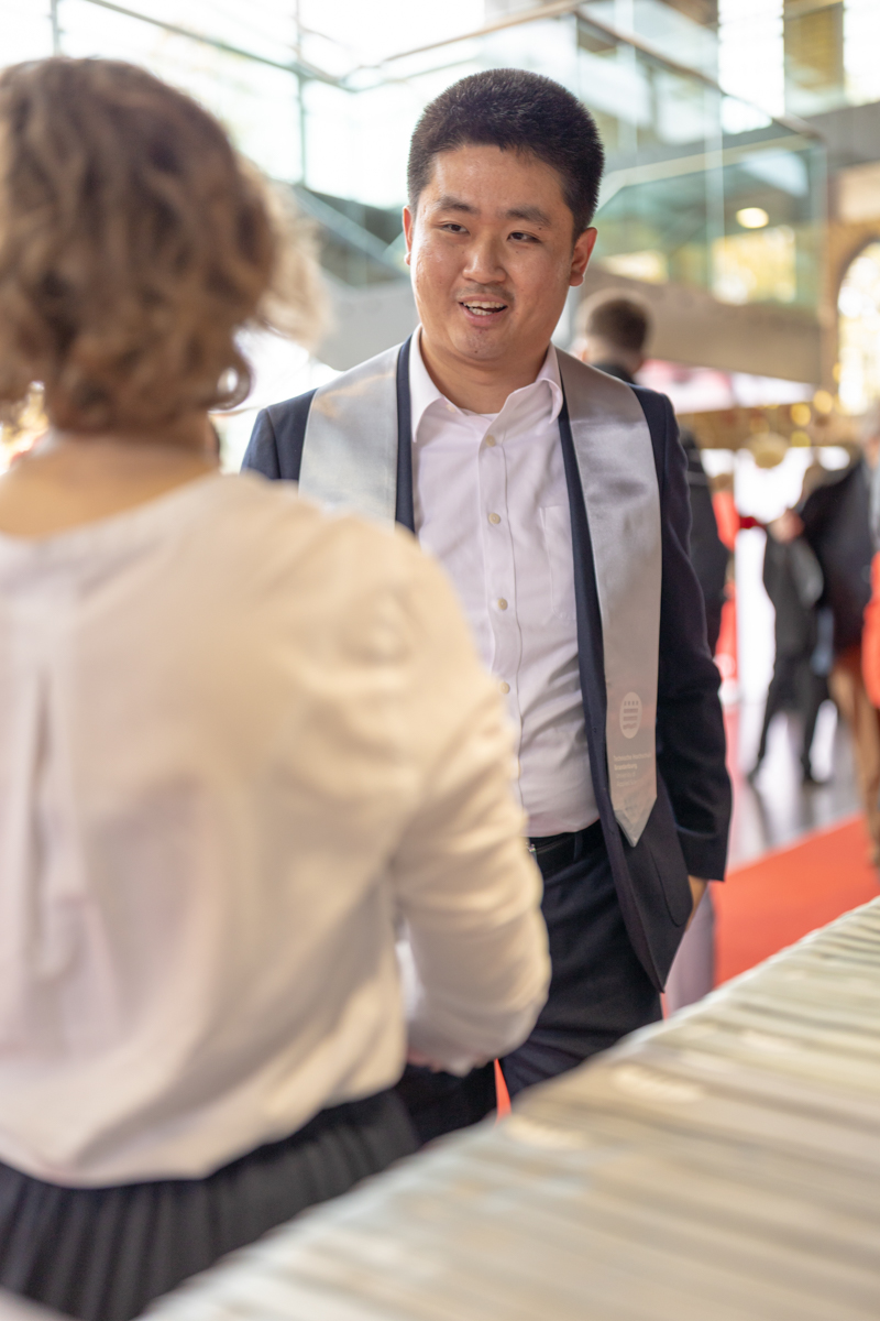 Mit Fayiq Abubakr stand ein weiterer internationaler Student auf der Bühne des Audimax. Er kam vor zehn Jahren als Flüchtling nach Deutschland und machte in der Folge an der THB sowohl einen Bachelor- als auch einen Masterabschluss. In einer kurzen Rede erzählte er von seiner persönlichen Geschichte, die von Herausforderungen geprägt war, in der er aber auch immer wieder gesellschaftlichen Zusammenhalt erlebt hat. Hierüber drückte er seine Dankbarkeit aus und wollte gleichzeitig andere auf ihrem weiteren Weg ermutigen.