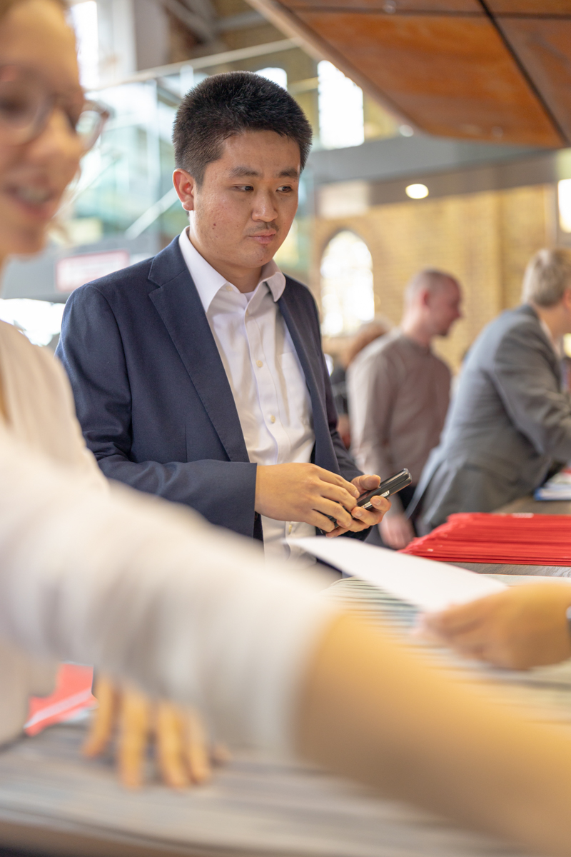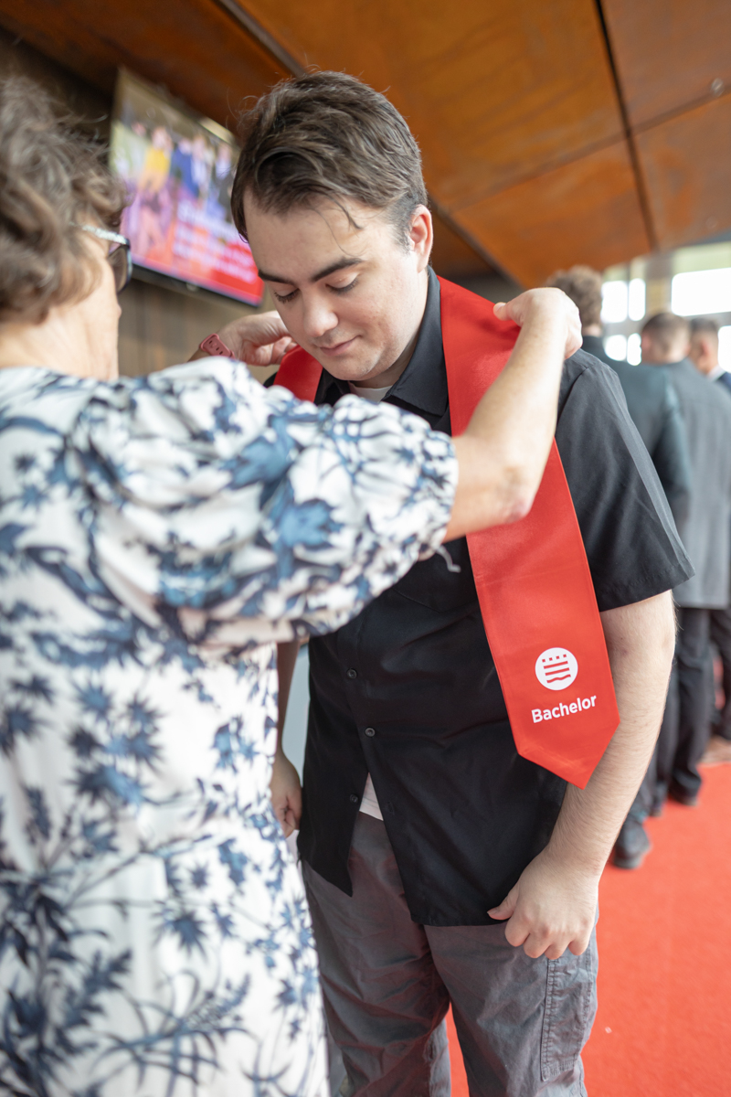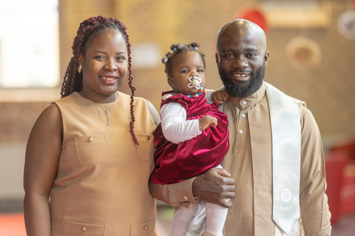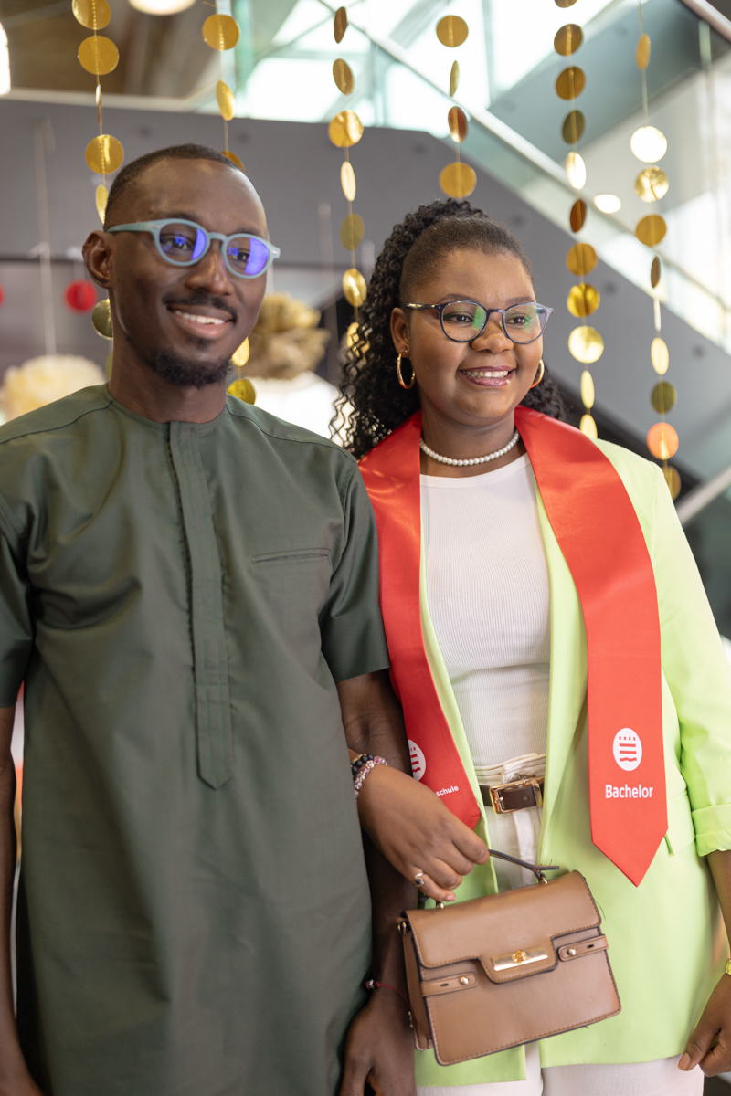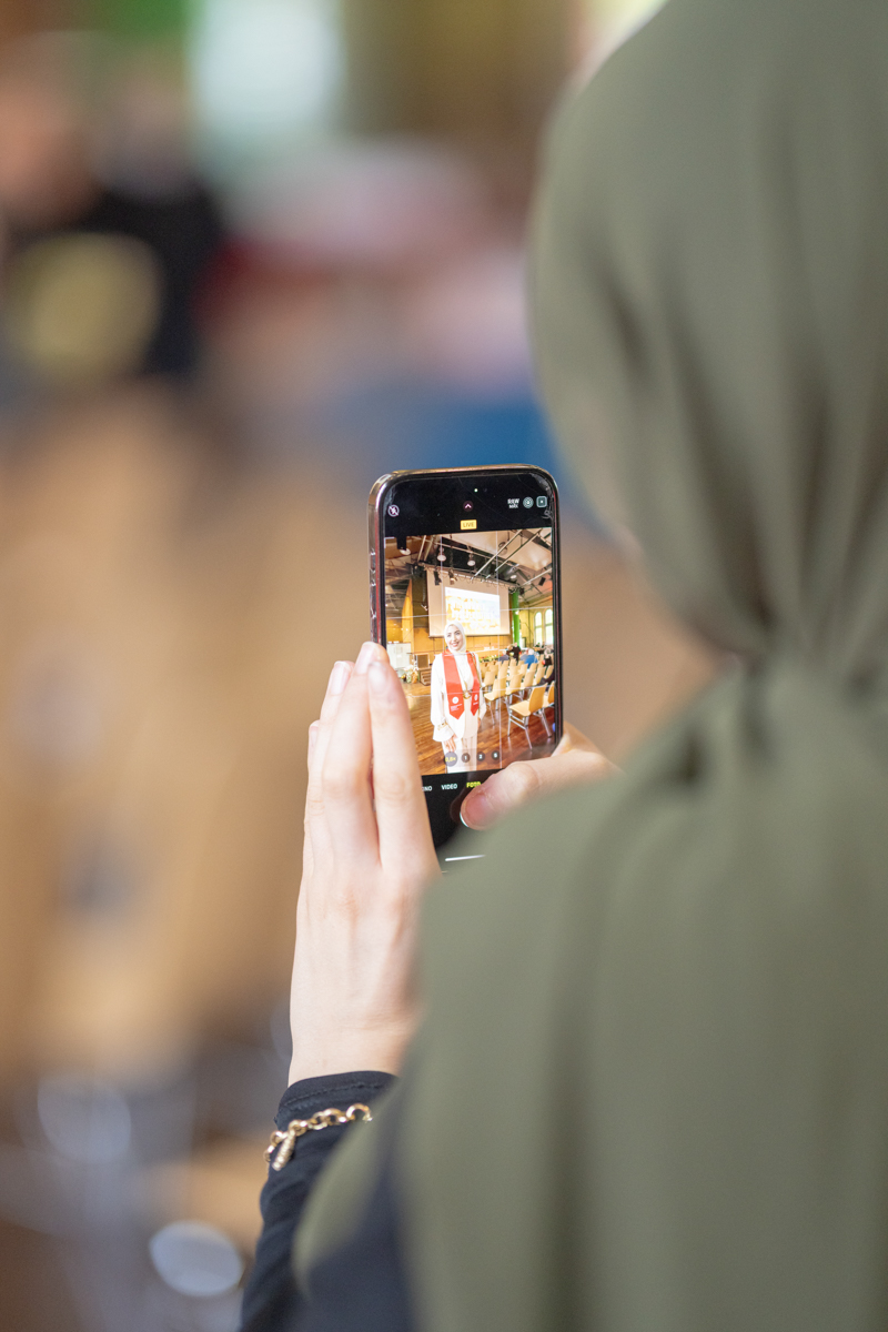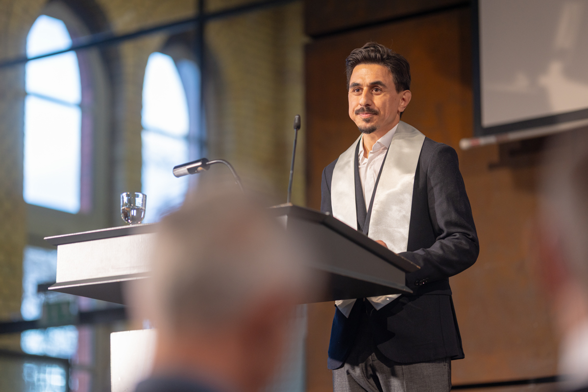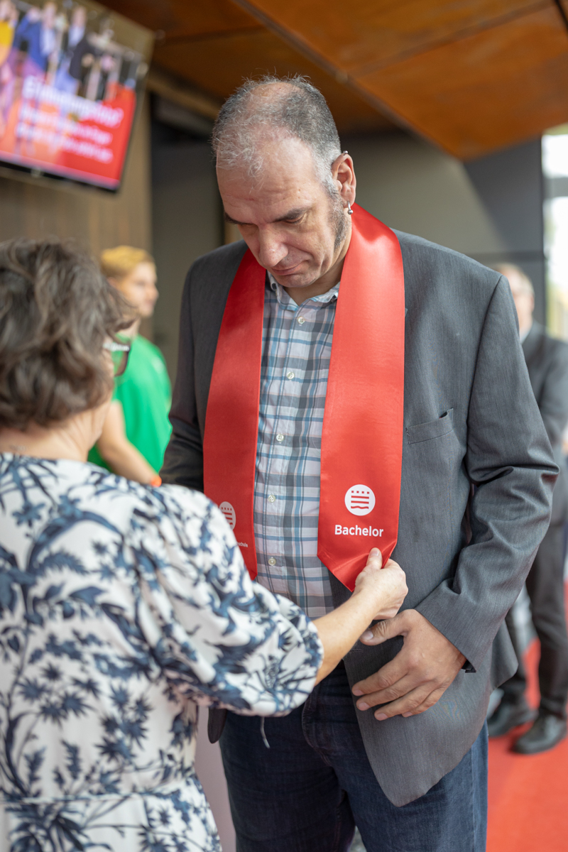 Mit Fayiq Abubakr stand ein weiterer internationaler Student auf der Bühne des Audimax. Er kam vor zehn Jahren als Flüchtling nach Deutschland und machte in der Folge an der THB sowohl einen Bachelor- als auch einen Masterabschluss. In einer kurzen Rede erzählte er von seiner persönlichen Geschichte, die von Herausforderungen geprägt war, in der er aber auch immer wieder gesellschaftlichen Zusammenhalt erlebt hat. Hierüber drückte er seine Dankbarkeit aus und wollte gleichzeitig andere auf ihrem weiteren Weg ermutigen.