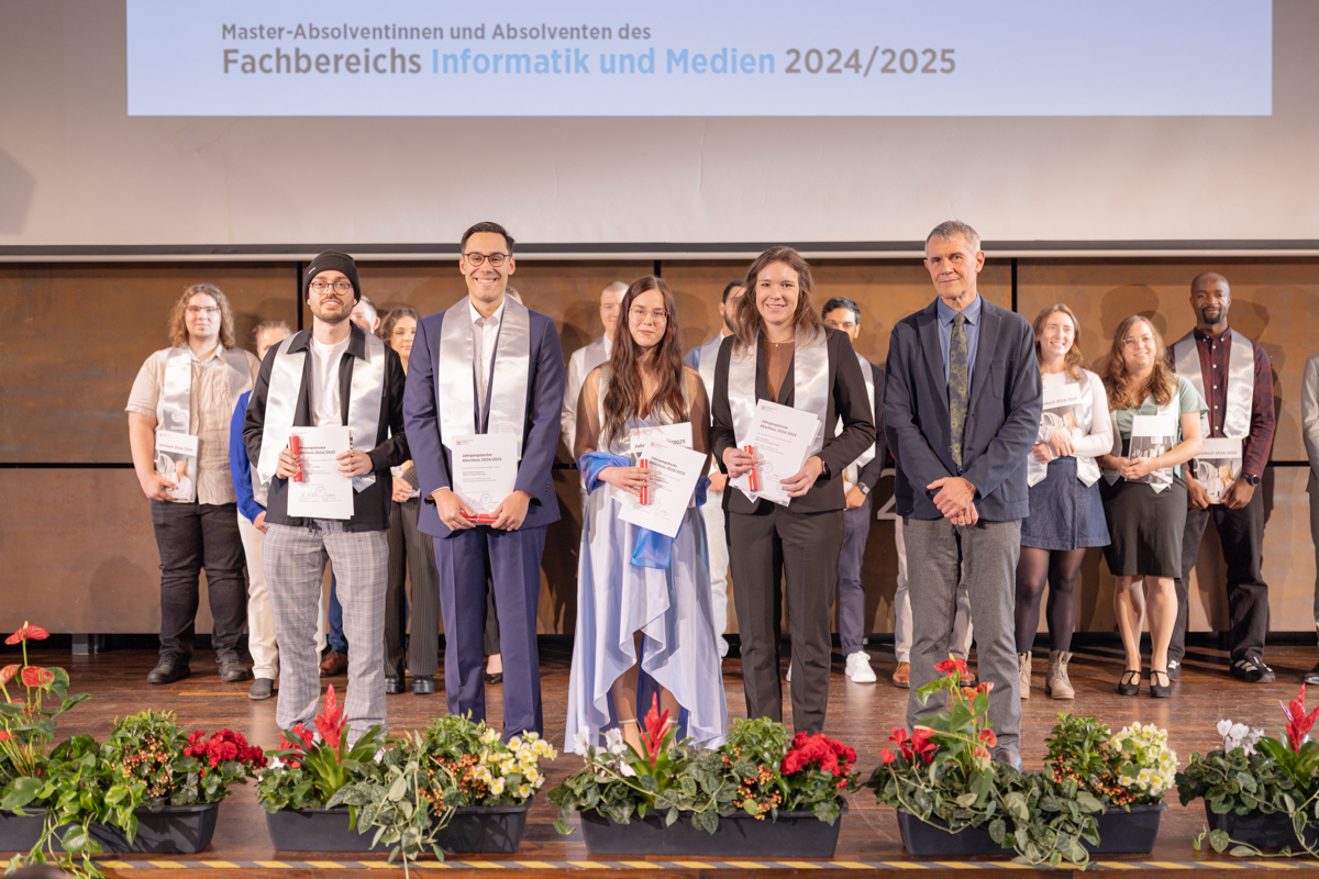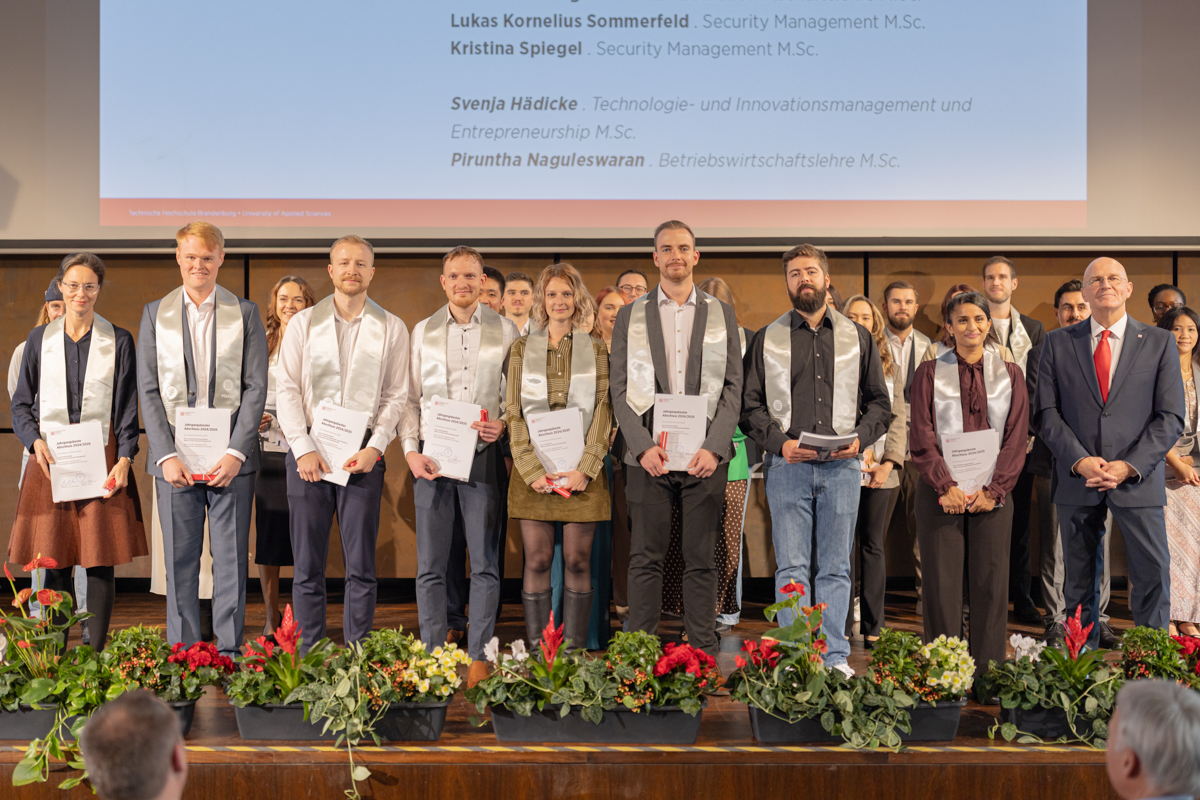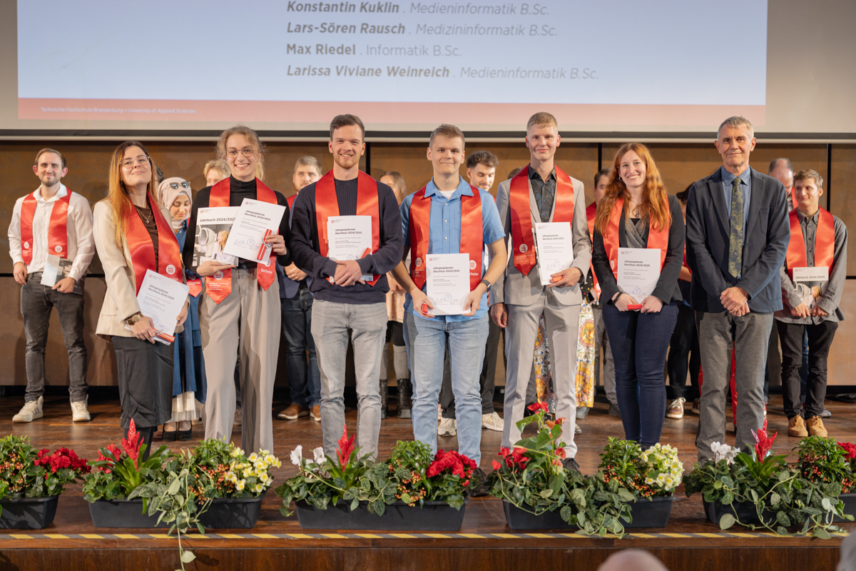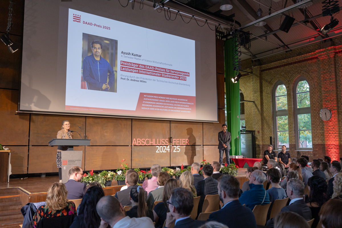 Gemeinsam mit den Dekanen der drei Fachbereiche Informatik und Medien, Technik sowie Wirtschaft gratulierte der Präsident den Absolventinnen und Absolventen zu ihrem erfolgreichen Studienabschluss. Die Dekane zeichneten überdies die 51 Jahrgangsbesten in ihren Fachbereichen aus. Im Rahmen der Abschlussfeier wurde außerdem der DAAD-Preis für hervorragende Leistungen internationaler Studierender an Ayush Kumar aus Indien, Masterabsolvent im Studiengang Wirtschaftsinformatik, verliehen.