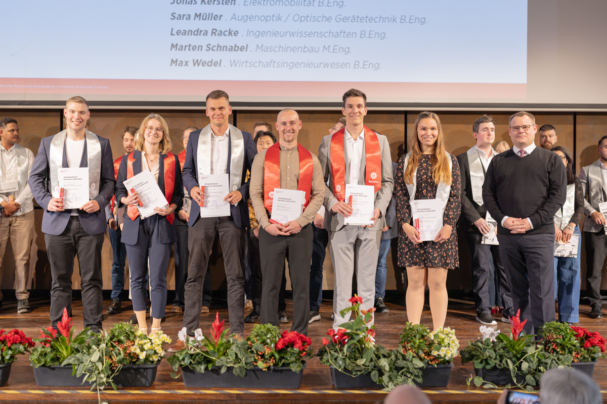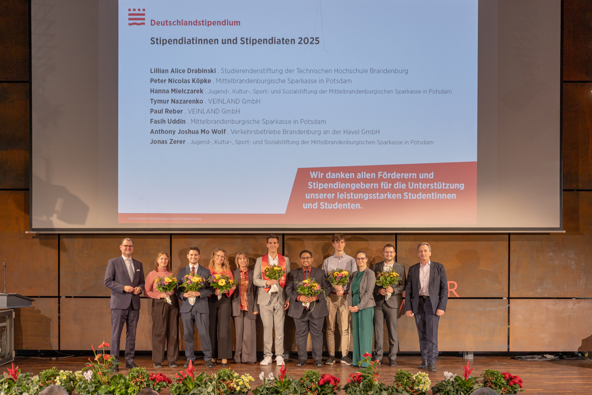Auch acht Deutschlandstipendien konnten während der Abschlussfeier überreicht werden. Die Stipendiatinnen und Stipendiaten profitieren hierbei für ein Jahr von einer monatlichen finanziellen Unterstützung, die ihnen jeweils zur Hälfte von verschiedenen Förderinnen und Förderern sowie vom Bundesministerium für Forschung, Technologie und Raumfahrt ermöglicht wird.