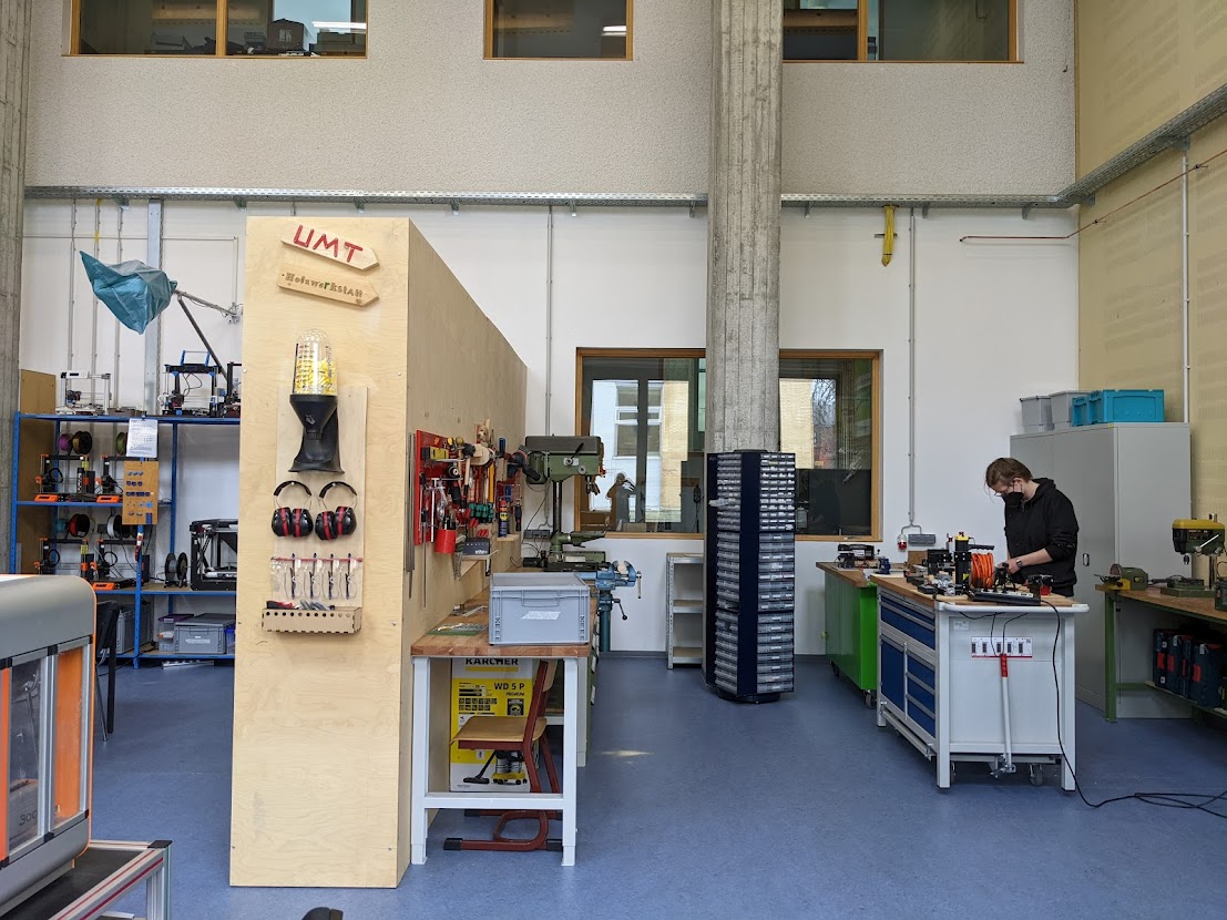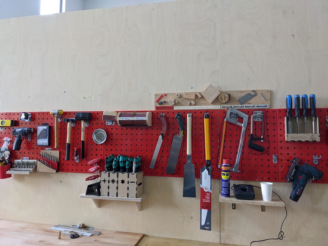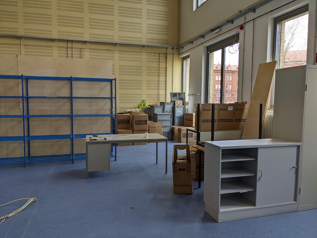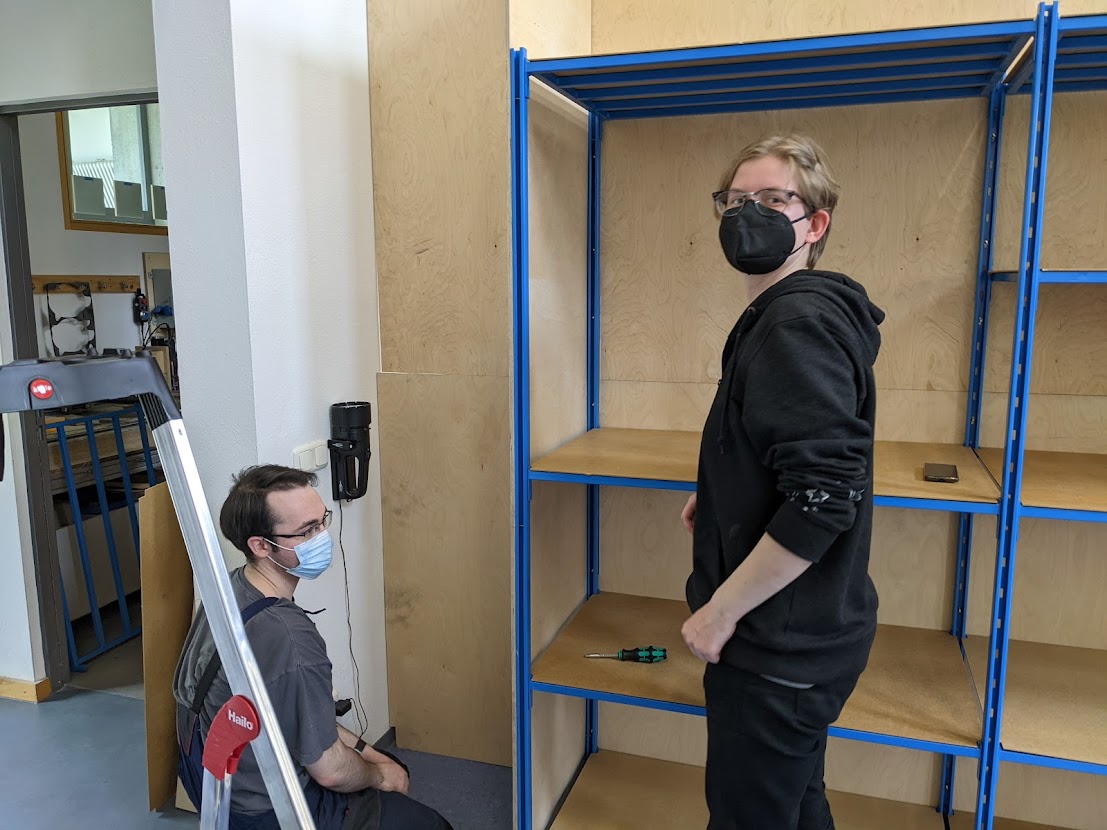 Das Wiedereinräumen haben wir genutzt, um alles ein bisschen besser zu machen: kürzere Laufwege, mehr Platz für Dinge, die häufig genutzt werden, bessere Sichtbarkeit des Arbeitsschutzboards, eine versteckte "Outdoor-Kram-Ecke" und ein zusätzliches Regal für eigene Projekte unserer Nutzer.